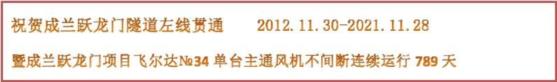 2019 年10 月1 日,飛爾達(dá)主通風(fēng)機(jī)抵達(dá)躍龍門隧道風(fēng)井后,在項(xiàng)目部指揮長(zhǎng)王海亮的指揮下,在項(xiàng)目部孫、王副指揮長(zhǎng)等領(lǐng)導(dǎo)的大力協(xié)助下,2019 年 10 月 6 日主通風(fēng)機(jī)安裝完成,開機(jī)運(yùn)行,主通風(fēng)機(jī)各項(xiàng)參數(shù)均達(dá)到設(shè)計(jì)要求。至今日,單臺(tái)主通風(fēng)機(jī)不間斷連續(xù)運(yùn)行789 天,保障躍龍門隧道左線順利貫通,我們相信右線貫通已在眼前,飛爾達(dá)風(fēng)機(jī)也將伴隨躍龍門隧道項(xiàng)目部一同完成最后的使命。